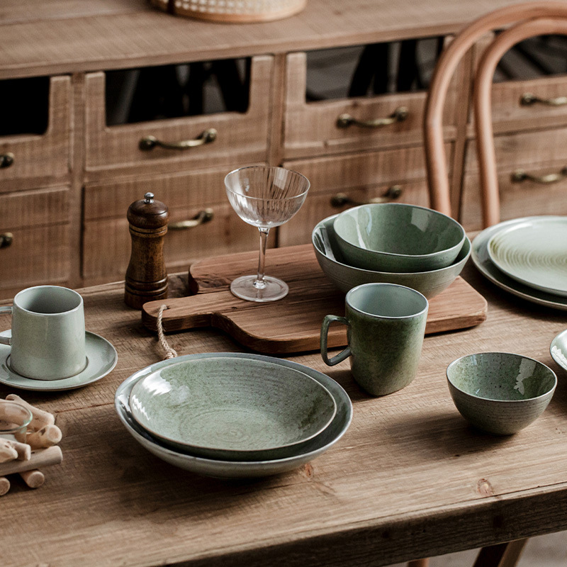 Đây là bộ đồ ăn mang một nét đẹp truyền thống lẫn nét hiện đại tinh tế. Màu xanh đặc trưng của bộ đồ ăn không chỉ làm nổi bật món ăn mà còn tạo sự hòa quyện với thiên nhiên. Những đường nét mềm mại và màu sắc phủ trên bề mặt gốm sứ, tạo nên một tác phẩm nghệ thuật độc đáo cho bữa ăn.